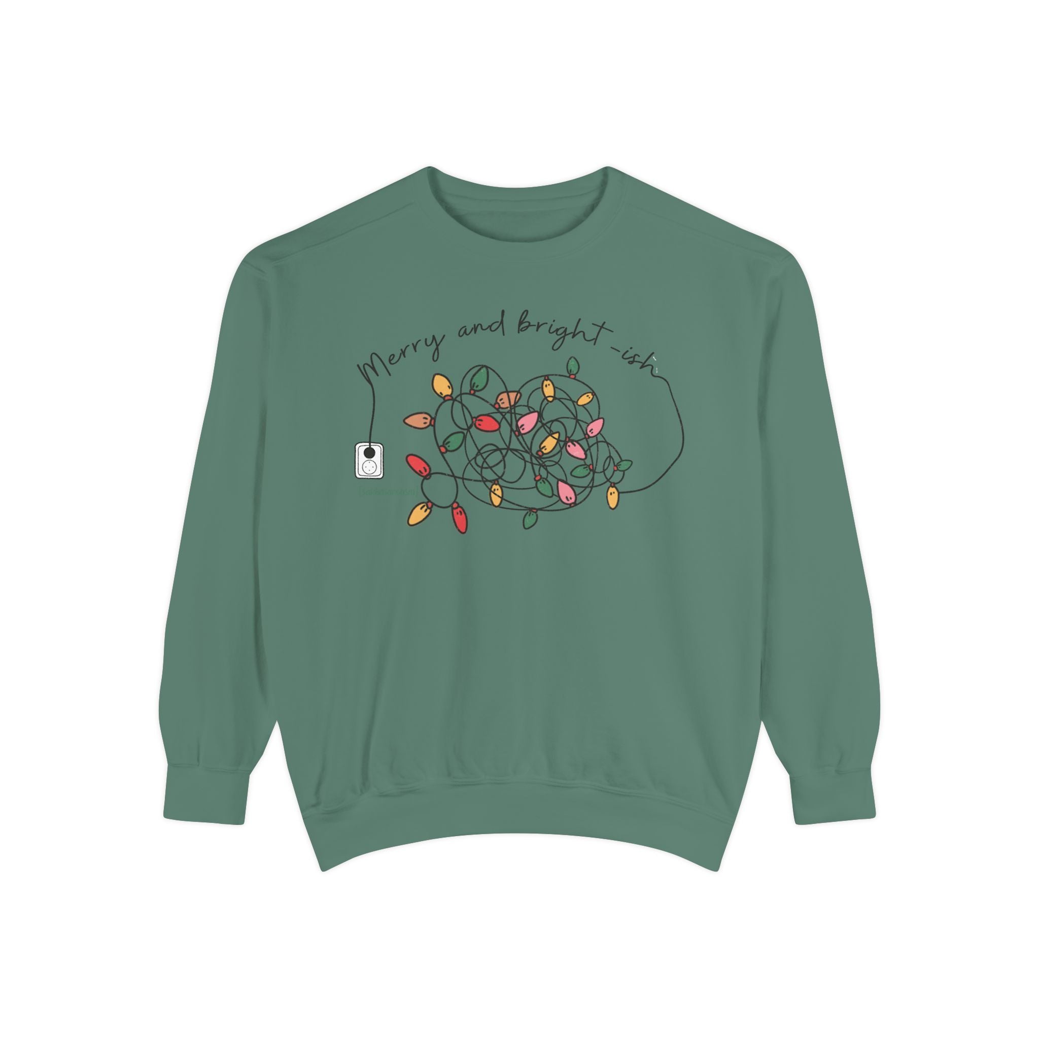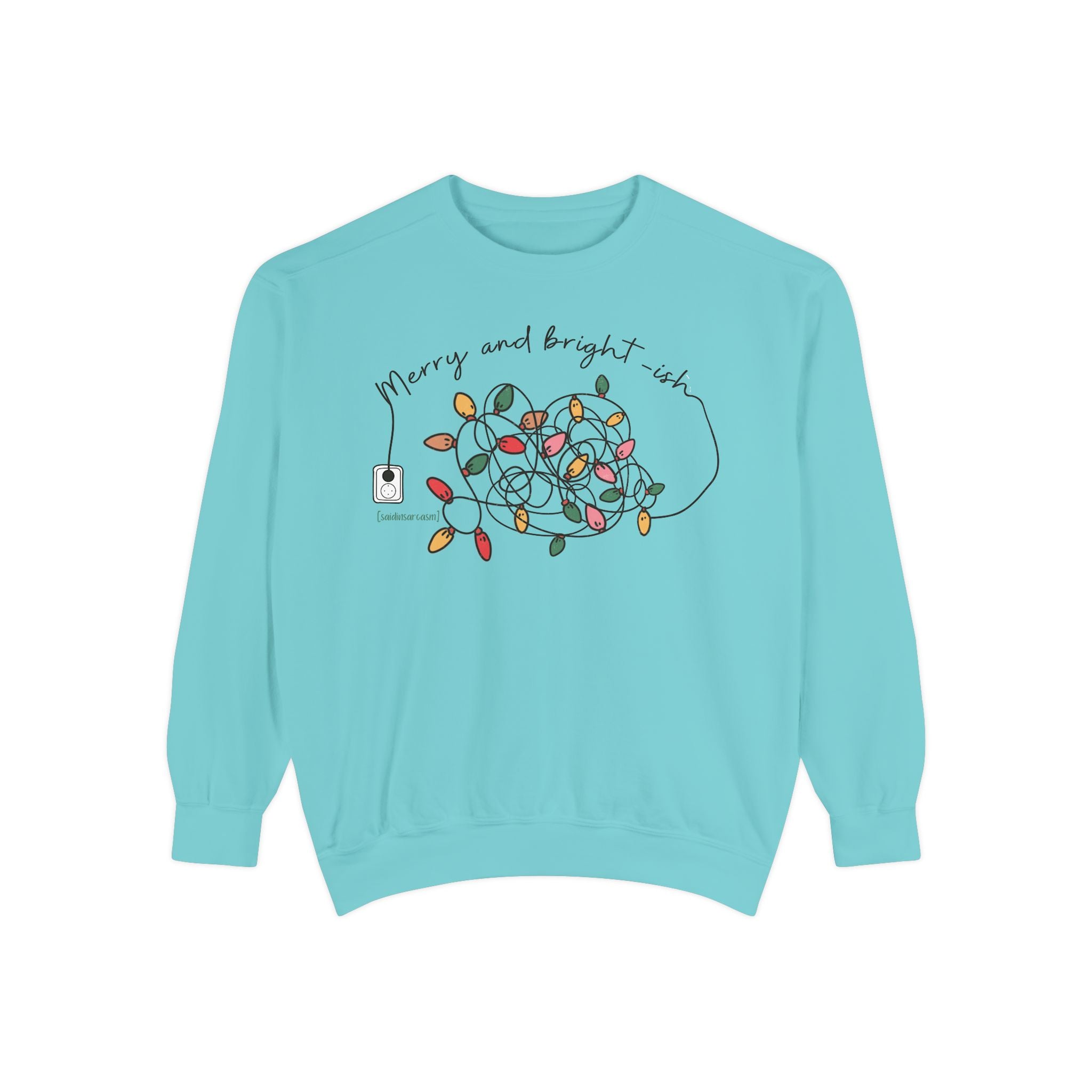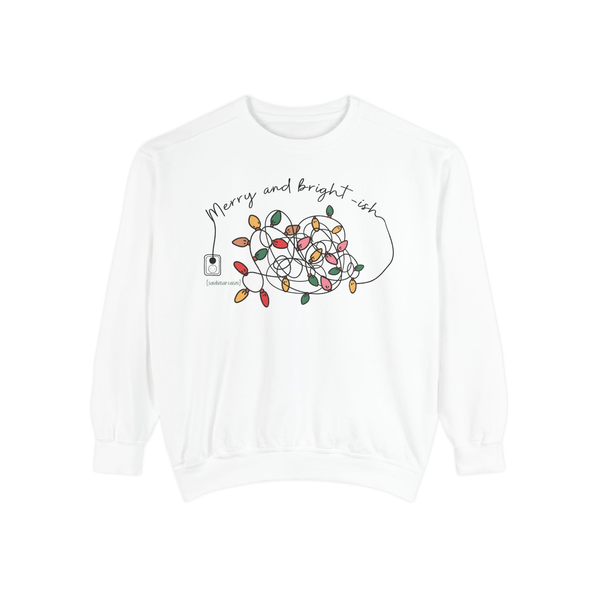 This relaxed-fit sweatshirt brings holiday cheer with a shrug. The front reads Merry and bright-ish with a string of lights that looks like it gave up first. It’s the perfect mood for anyone trying to stay festive while the season refuses to cooperate. The garment-dyed fleece feels soft and slightly lived-in, and the ribbed collar, cuffs, and hem keep the shape steady through every tangled moment.