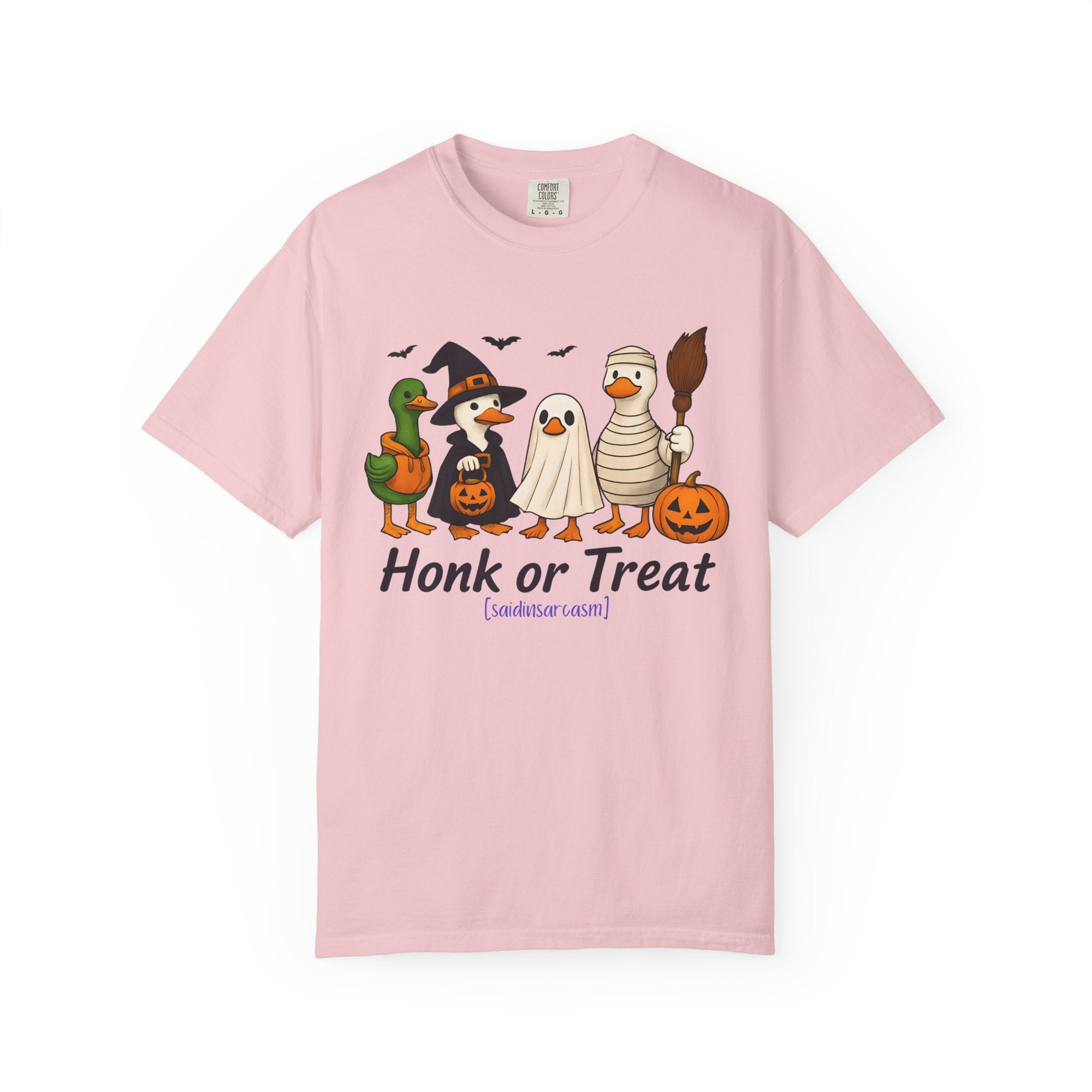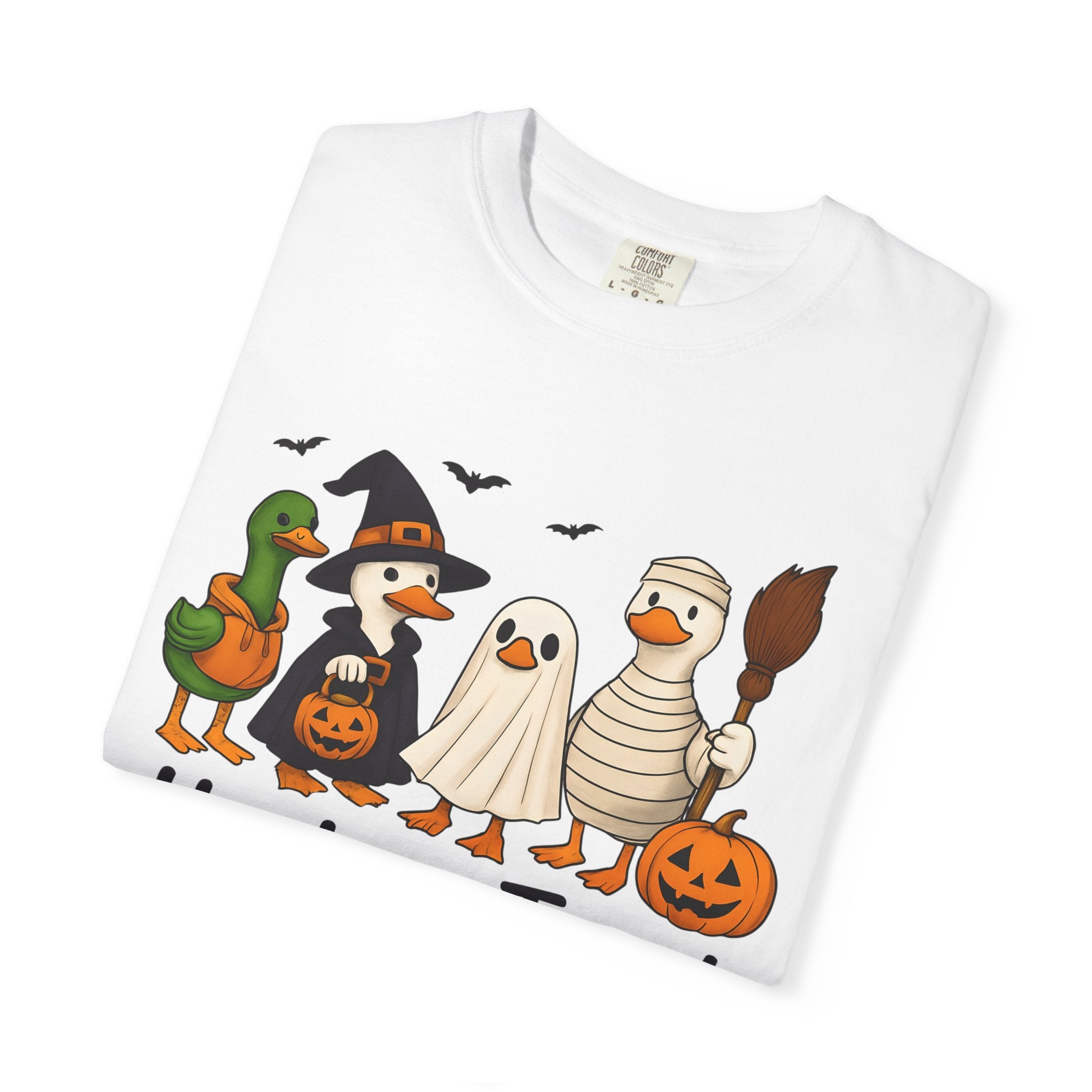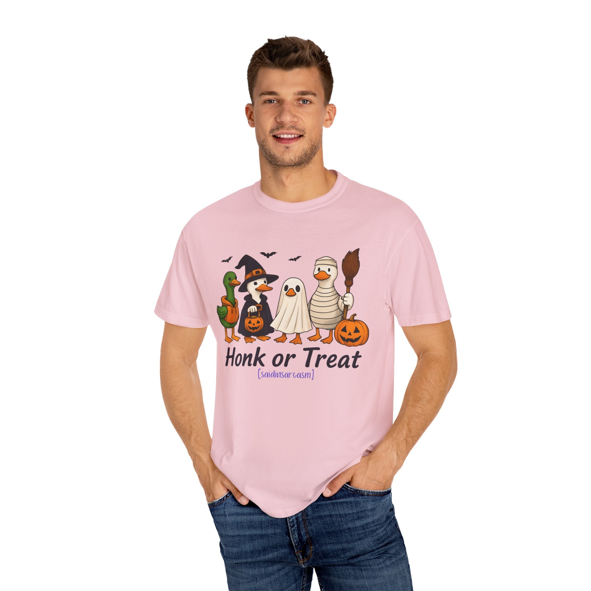 Quack up your Halloween wardrobe with this playful Honk or Treat tee. Featuring an adorable duck decked out for spooky season, it’s the perfect mix of cozy comfort and festive fun. Whether you’re trick-or-treating, hitting a Halloween party, or just enjoying pumpkin spice season in style, this shirt delivers charm and a touch of humor.