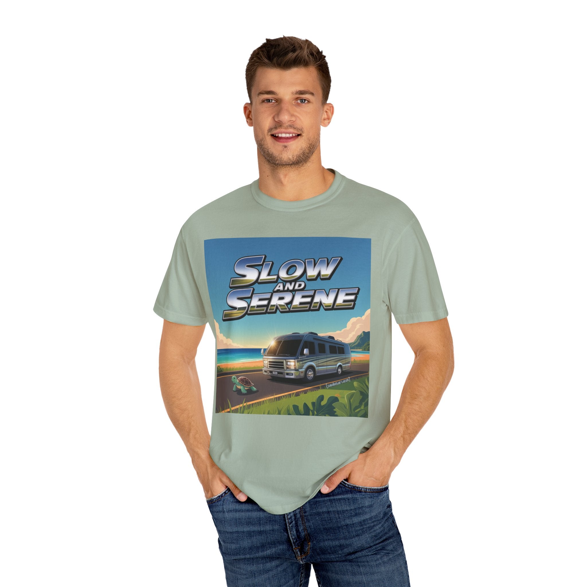 Fast? No thanks. This tee celebrates the art of taking your time — featuring a shiny silver Slow and Serene logo...